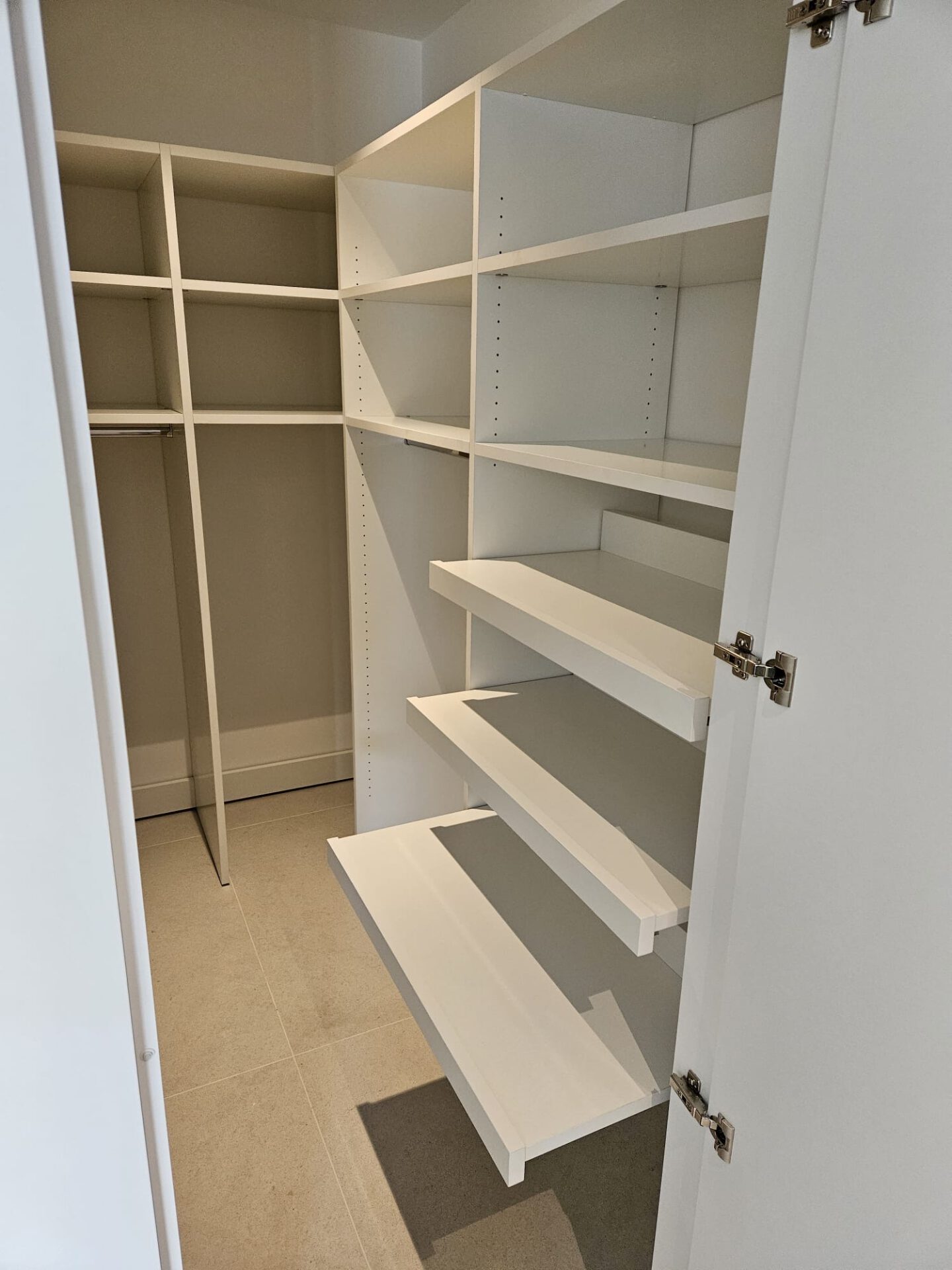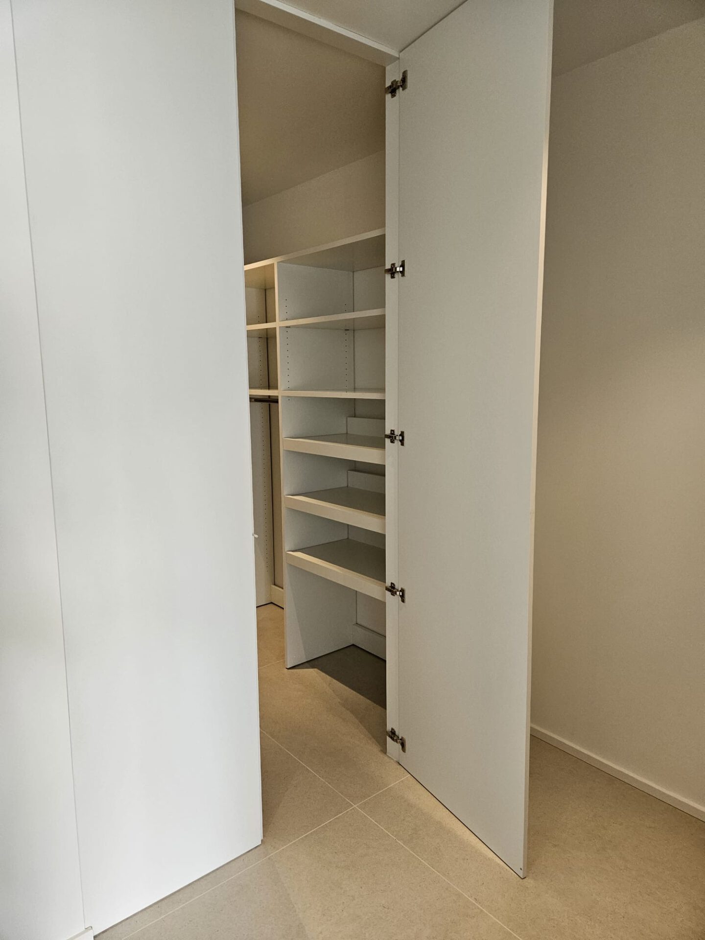 Dieser begehbare Schrank wurde individuell geplant, um maximale Flexibilität und Stauraum zu schaffen. Mit verstellbaren Einlegeböden, Kleiderstangen und Tablar-Auszügen lässt sich die Innenaufteilung ganz nach den persönlichen Bedürfnissen gestalten. Kleidung, Accessoires und andere Gegenstände können so übersichtlich und ordentlich verstaut werden.