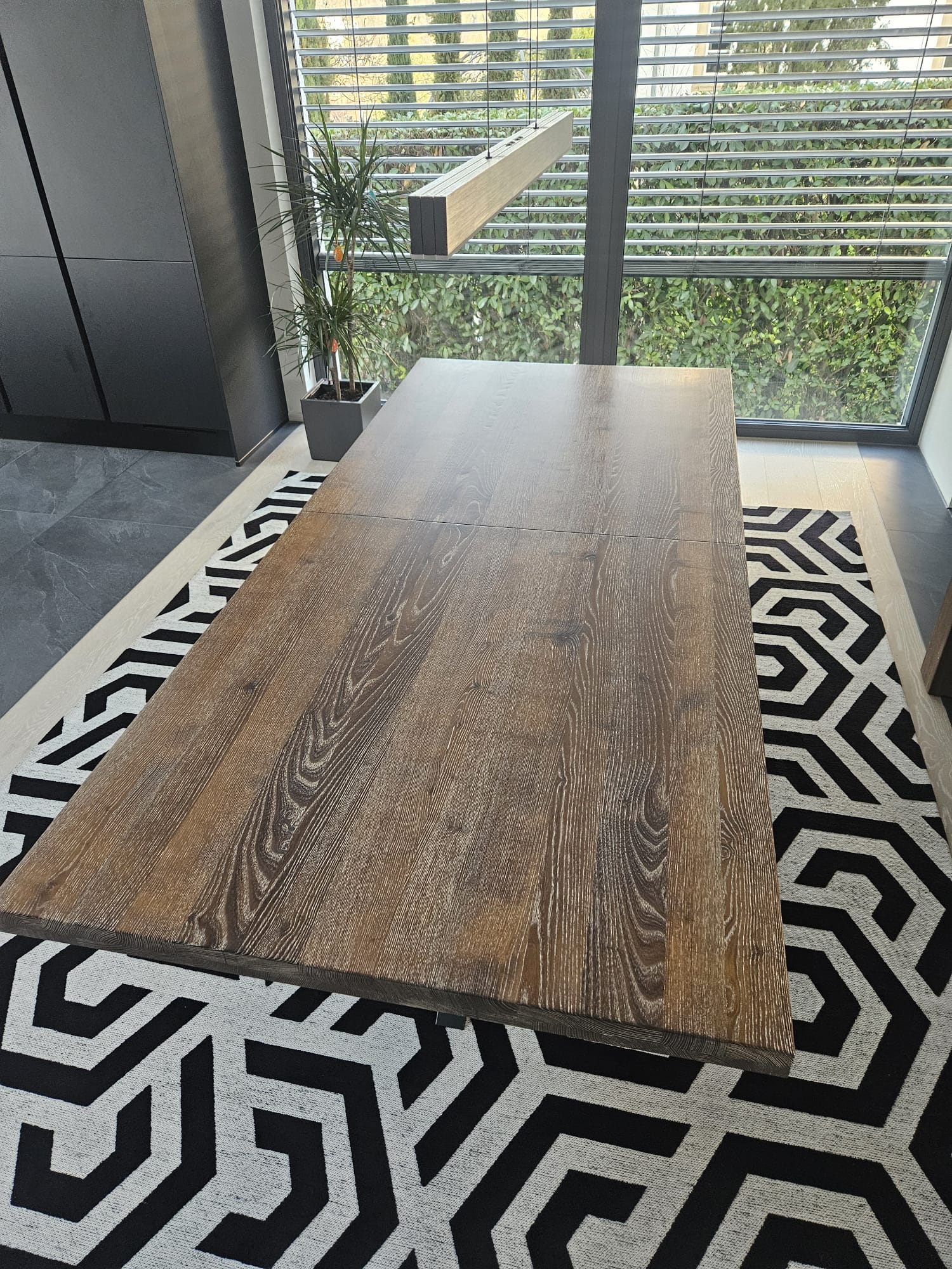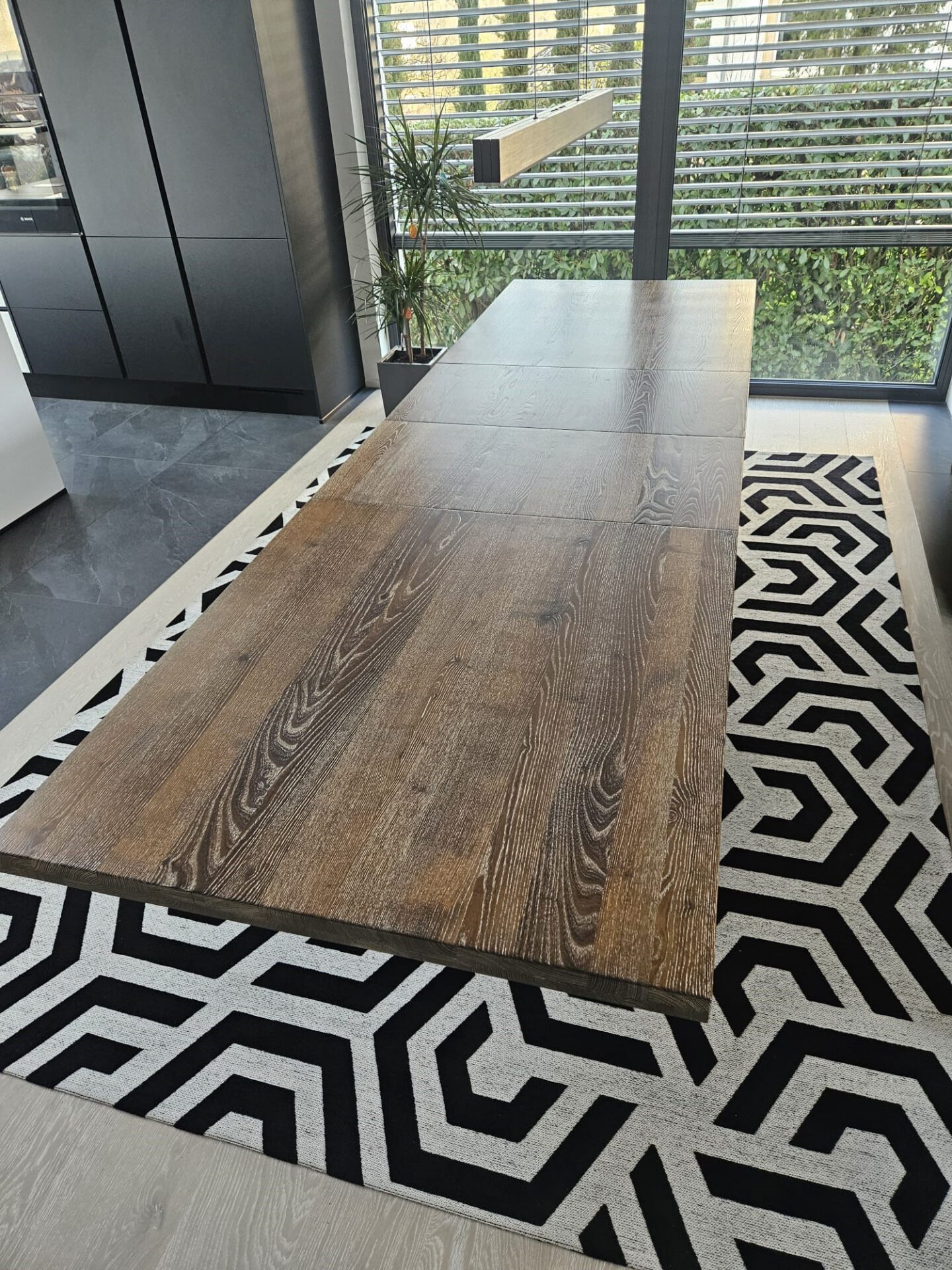 Dank zwei einlegbarer Platten lässt sich die Tischfläche flexibel erweitern – von 2,20 Metern auf beeindruckende 3,20 Meter. So bietet der Tisch genügend Platz für die ganze Familie oder gesellige Abende mit Freunden. Die Ausziehfunktion ist leicht bedienbar und macht den Tisch zu einem vielseitigen Begleiter für jede Gelegenheit.