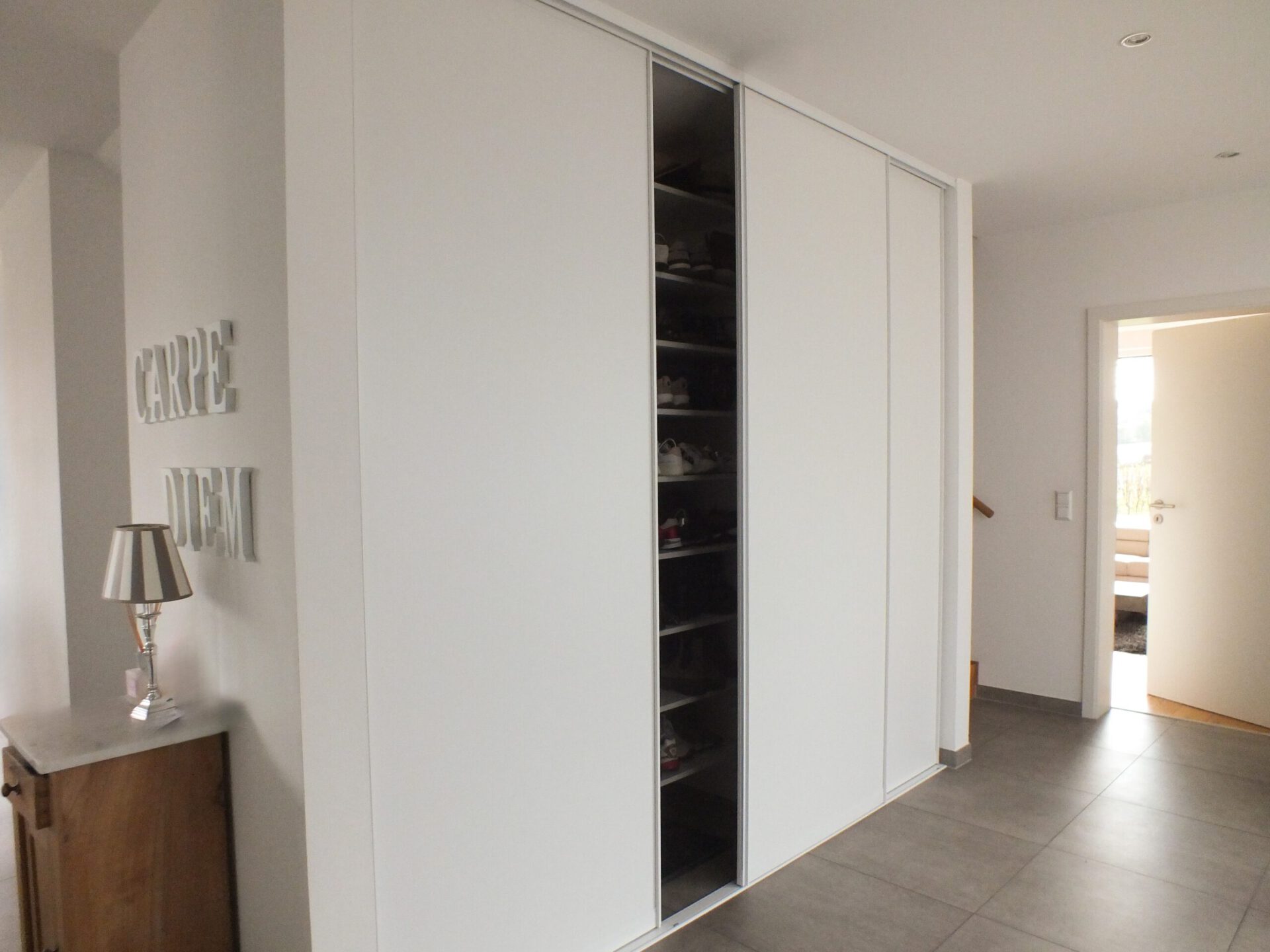 Dieser maßgefertigte Garderobenschrank überzeugt durch sein zeitloses Design in Weiß und seine praktische Funktionalität. Ausgestattet mit modernen Schiebetüren fügt er sich harmonisch in den Raum ein und sorgt für eine klare, elegante Optik. Die grifflosen Fronten unterstreichen die schlichte Ästhetik und schaffen ein aufgeräumtes Gesamtbild.