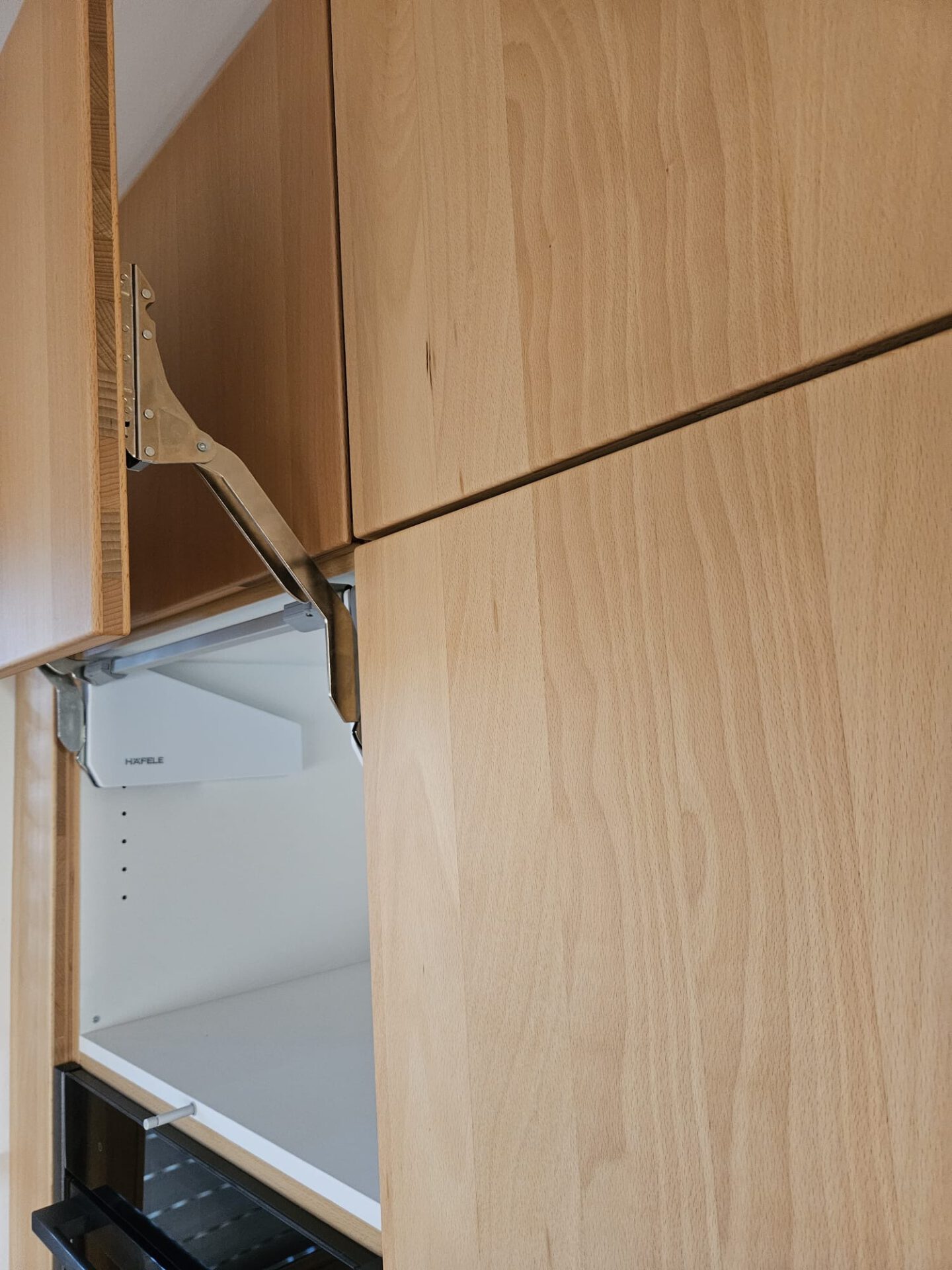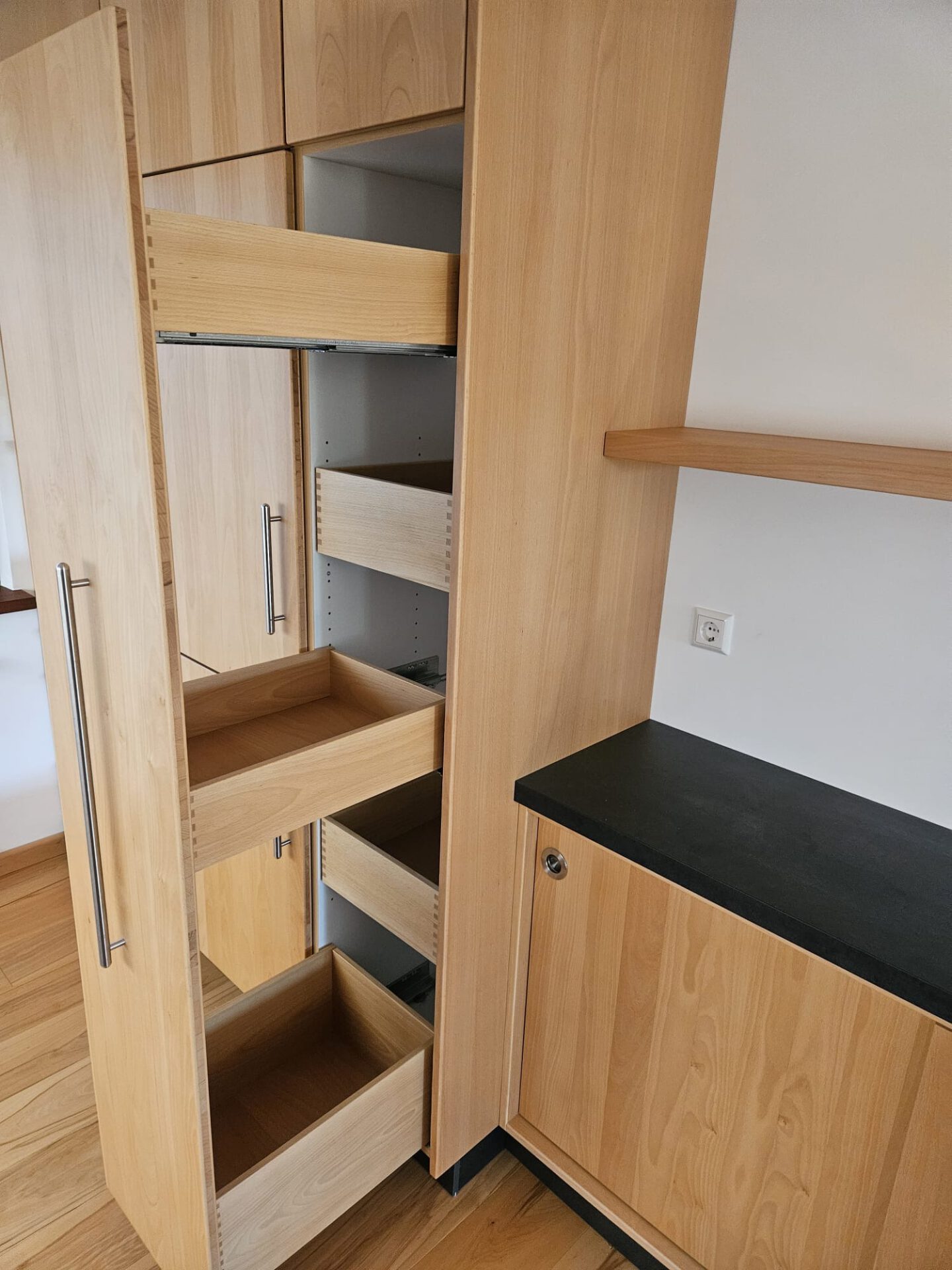 Diese maßgefertigte Küche verbindet zeitlose Eleganz mit praktischer Funktionalität. Die hochwertigen Buchenfronten bringen natürliche Wärme in den Raum und verleihen der Küche eine edle, langlebige Optik. Jedes Detail wurde individuell geplant, um Stauraum und Komfort optimal auf die Bedürfnisse des Alltags abzustimmen.