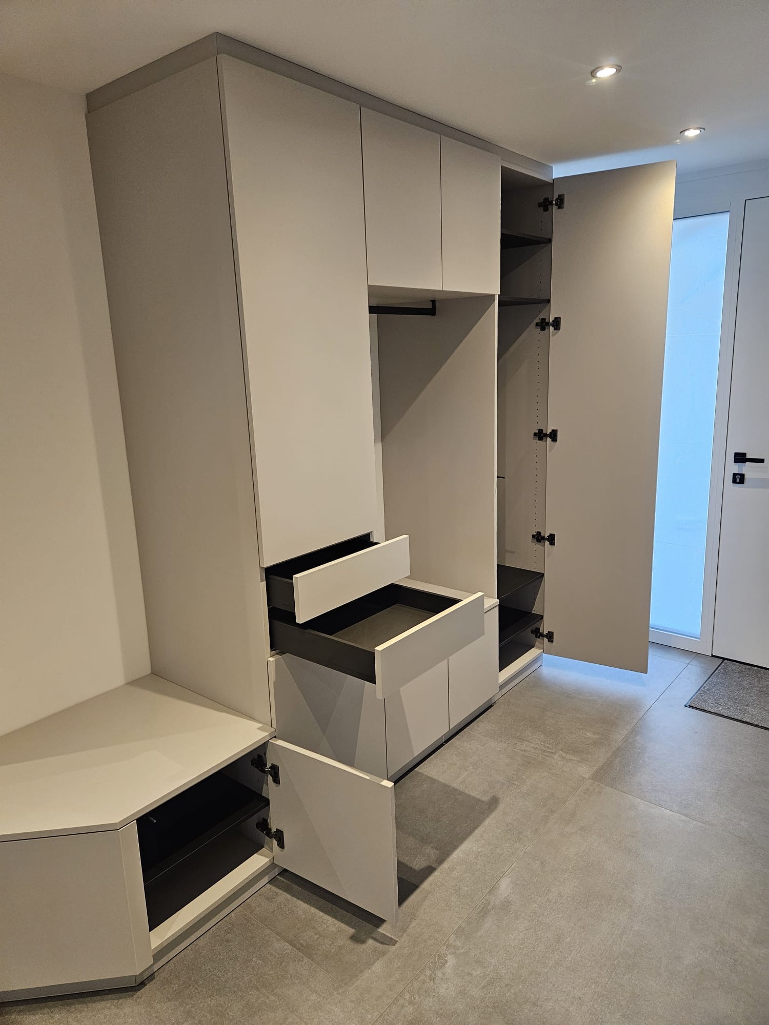 Bei diesem Projekt entstand eine maßgefertigte Garderobe, die modernes Design mit hoher Funktionalität verbindet. Gefertigt aus robustem, beschichtetem Plattenwerkstoff überzeugt sie durch ihre langlebige Qualität und eine elegante Oberfläche in der Dekorfarbe „Delfingrau“. Klare Linien und eine durchdachte Aufteilung sorgen dafür, dass die Garderobe nicht nur optisch ansprechend, sondern auch praktisch im Alltag ist.