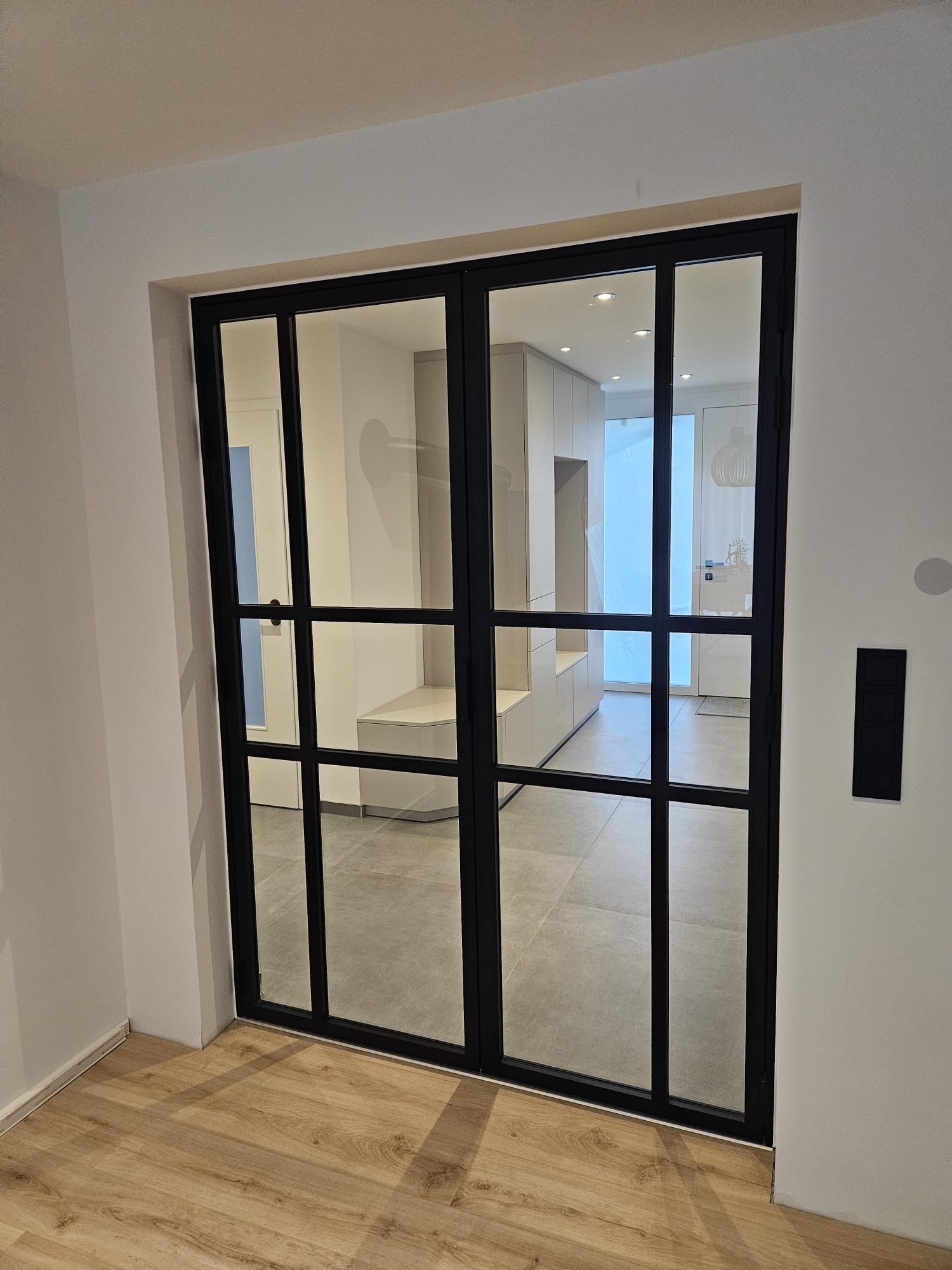 Als stilvolle Ergänzung wurde eine Loft-Tür im Industrial Look eingebaut. Der markante Metallrahmen umfasst zwei Türblätter aus Klarglas mit aufgesetzten Sprossen, die für eine moderne, offene Raumwirkung sorgen. Alle Metallteile sind in Schwarz pulverbeschichtet und verleihen der Tür eine hochwertige, industrielle Optik mit starkem Charakter.