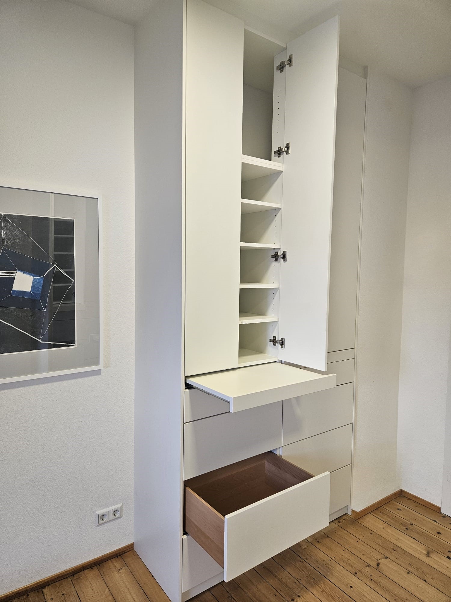 Schlafzimmerschrank in Weiß mit Push-to-Open, Tablar-Auszug und flexiblen Fachböden – zeitlos, funktional und geräumig.